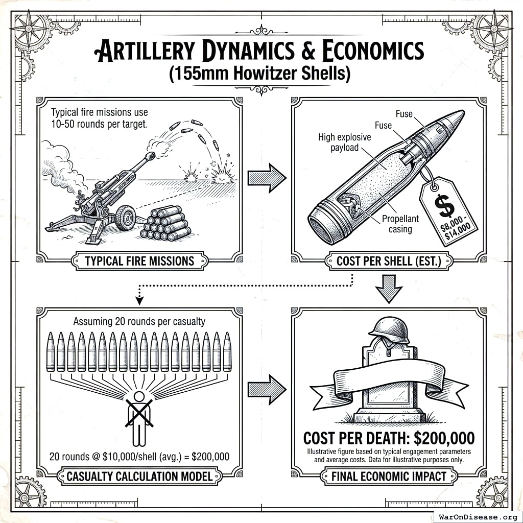 Twenty big shells at ten thousand dollars each equals two hundred thousand dollars per casualty. Artillery is expensive. Being on the receiving end is worse.