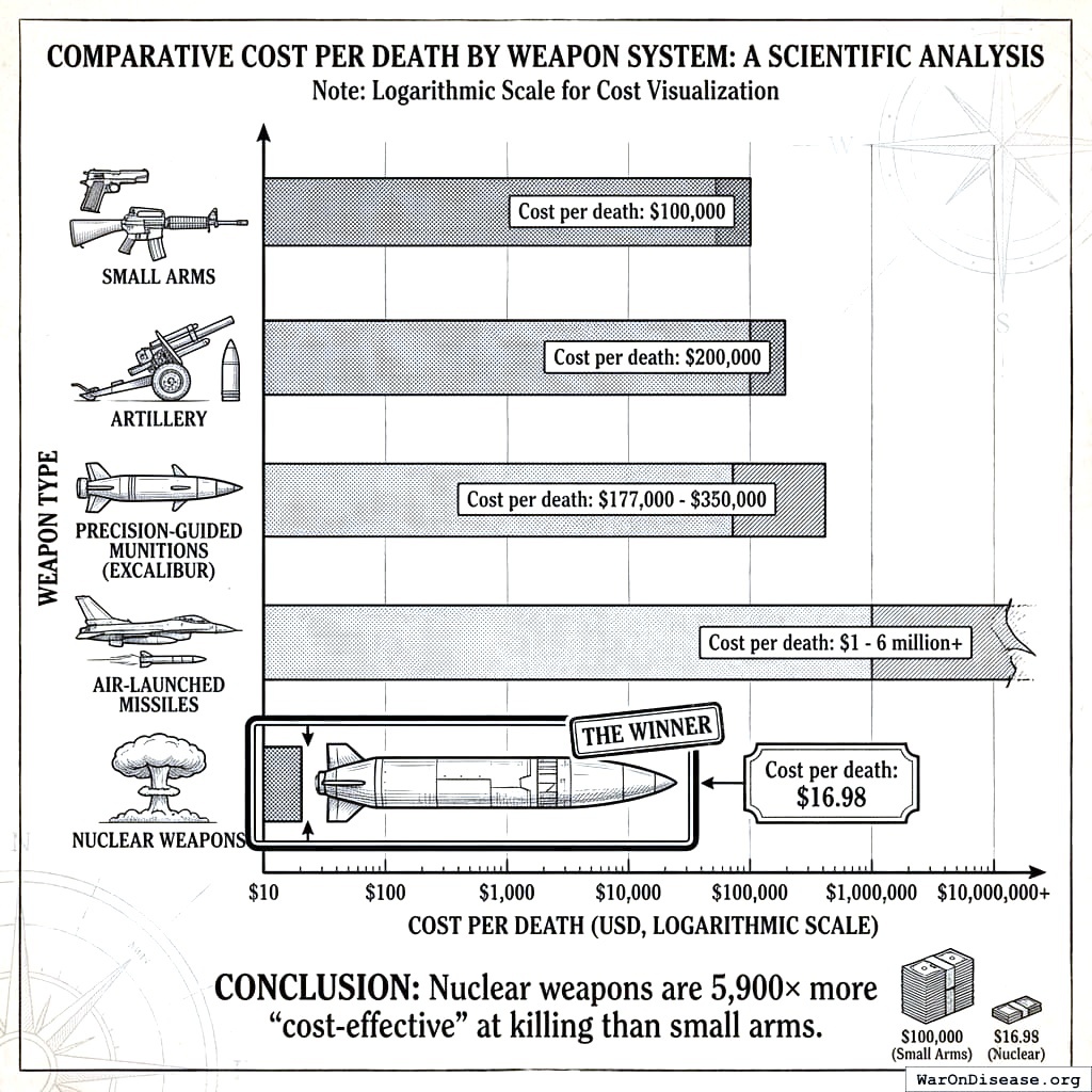 Conventional weapons: expensive per death. Nuclear weapons: so cheap per death that accountants get excited. The accountants should probably not get excited about this.