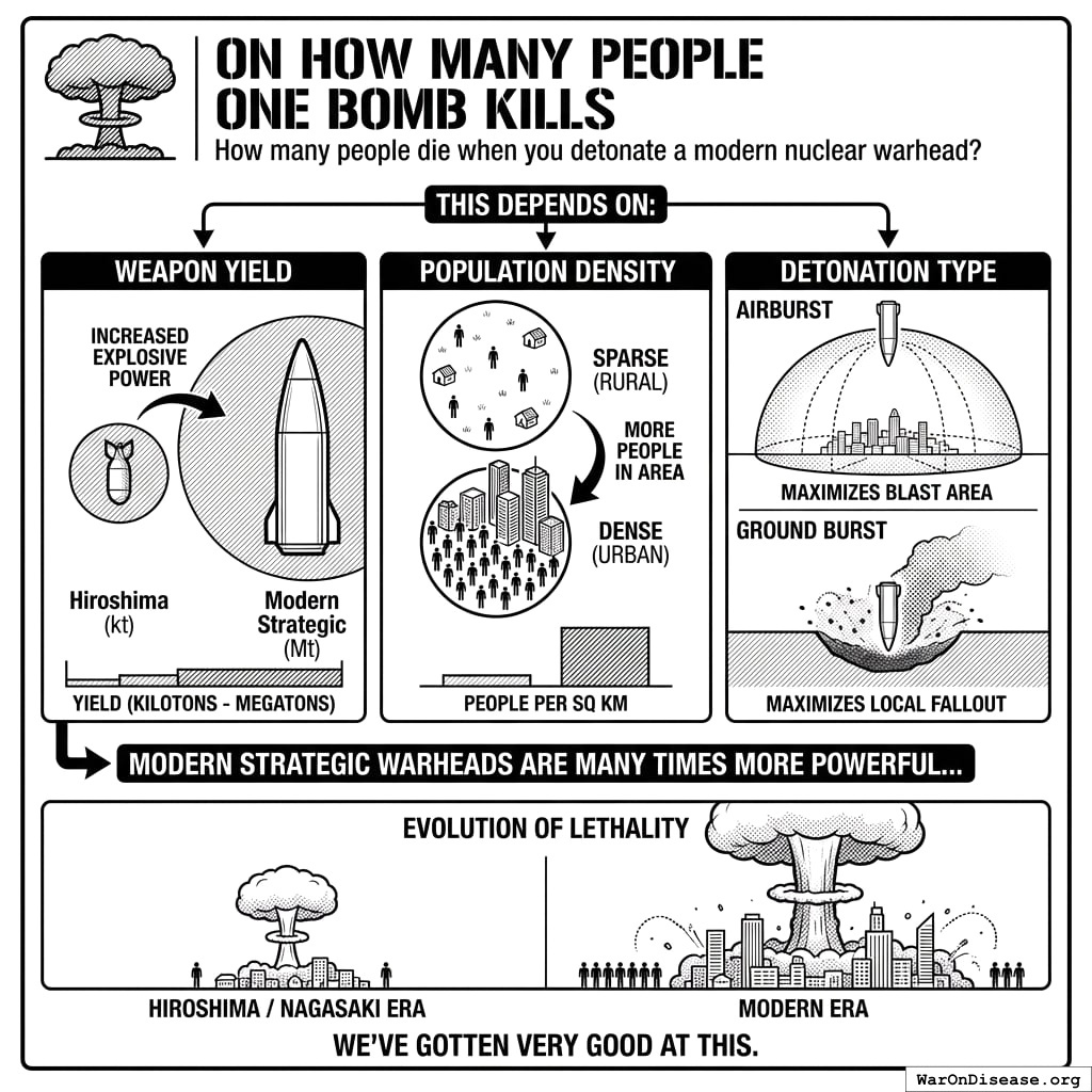How many people a nuclear bomb kills depends on three things: how big the bomb is, how many people are standing nearby, and whether you blow it up in the air or on the ground. Modern bombs are better at all three.
