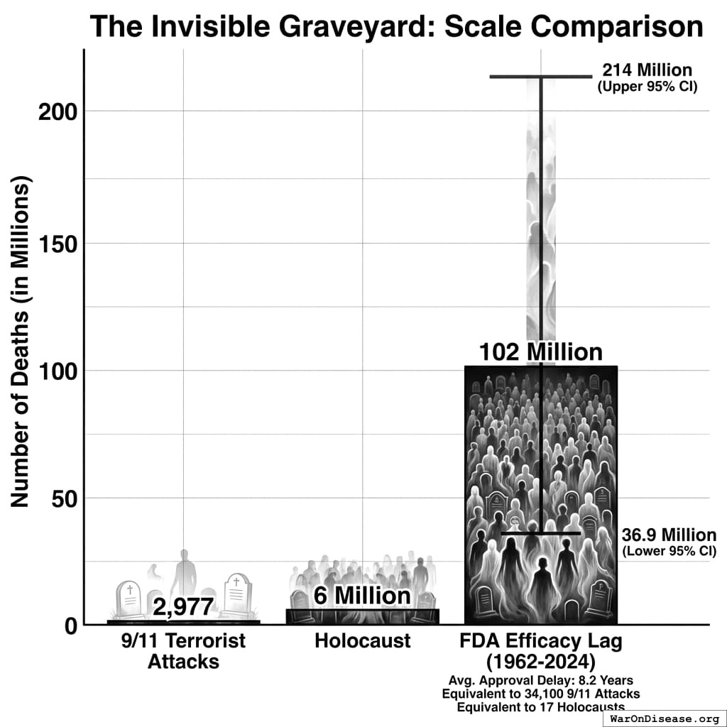Historical mortality (1962-2024): Approximately 102 million people died waiting for approved drugs during their 8.2 years (95% CI: 4.85 years-11.5 years) approval delays. This is a lower bound - it excludes drugs never developed due to cost barriers.