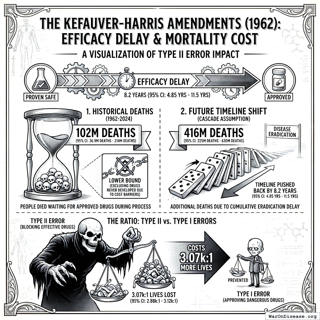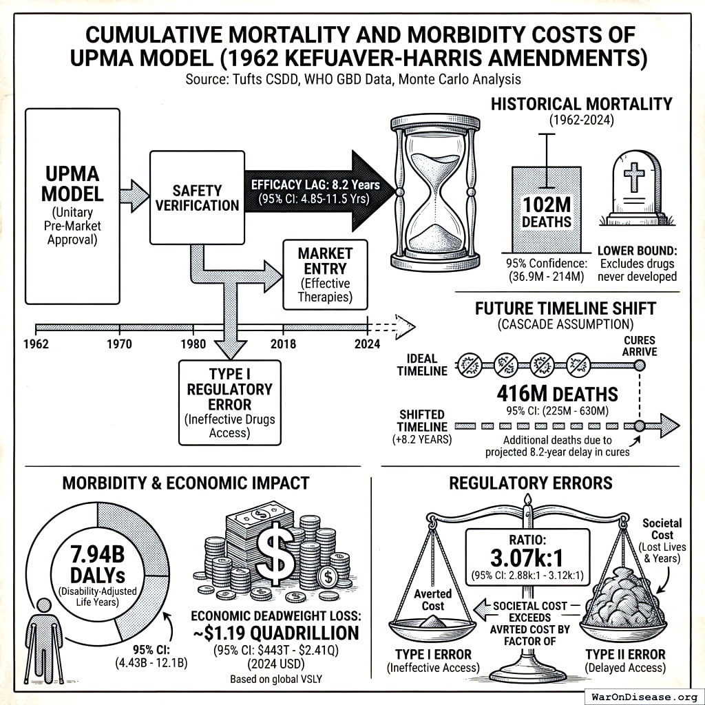This study quantifies the cumulative mortality and morbidity costs associated with the Unitary Pre-Market Approval (UPMA) model mandated by the 1962 Kefauver-Harris Amendments. By enforcing efficacy testing prior to market entry, the current regulatory framework imposes an average “Efficacy Lag” of 8.2 years (95% CI: 4.85 years-11.5 years) post-safety verification.
