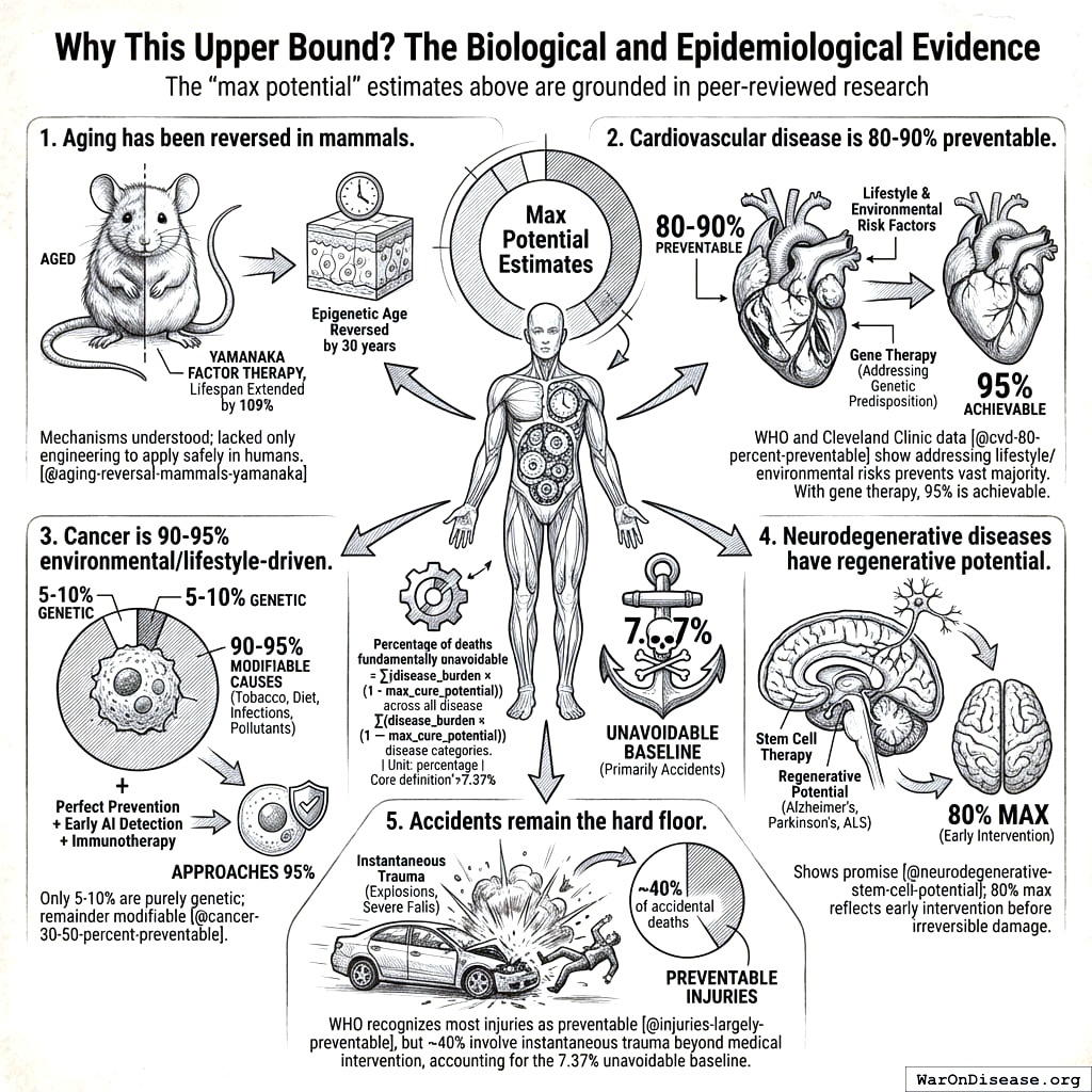 R3 paradigm: Rejuvenation (restoring cell function), Regeneration (stimulating repair), Replacement (substituting lost cells) Alzheimer’s: Stanford study showed stem cell transplants reduced brain abnormalities in mice; Neural Stem Cell Therapy shown to improve cognitive function and reduce amyloid plaques Parkinson’s: Clinical trial found Neural Stem Cell Therapy significantly improved motor function and was well-tolerated ALS/Huntington’s: MSC (mesenchymal stem cell) therapy effectiveness confirmed; slows ALS progression Challenge: Clinical trials often enroll patients at advanced stages; many preclinically promising drugs ineffective in late-stage human trials Current status: Largely experimental and early clinical trial stages; researchers working to overcome delivery challenges, safety concerns, and targeting widespread neuronal damage Note: 80% theoretical max for neurodegenerative reflects early-stage intervention potential; current treatments limited ( 10% effective) Additional sources: https://pmc.ncbi.nlm.nih.gov/articles/PMC7926761/ | https://med.stanford.edu/news/all-news/2023/09/stem-cell-alzheimers.html | https://stemcellres.biomedcentral.com/articles/10.1186/s13287-025-04285-7