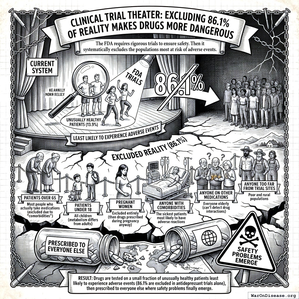 Result: In antidepressant trials alone, 86.1% of real patients are excluded. The drugs are tested on the healthiest people alive, declared “safe and effective,” then handed to everyone the trial specifically avoided. Nobody knows whether the drug works for those populations, what the interactions are, or what the real adverse event profile looks like. This is how Vioxx, Fen-Phen, and Bextra all got approved, celebrated, prescribed to millions, and then withdrawn after killing people whose demographics the trials had carefully excluded. The 8.2 years (95% CI: 4.85 years-11.5 years) delay didn’t make these drugs safer. It made them seem safer by hiding the danger behind an exclusion list.