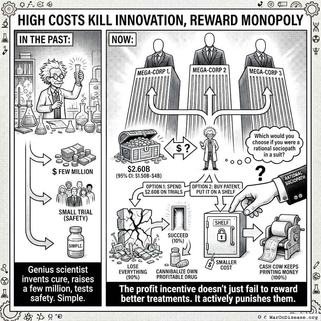 The profit incentive doesn’t just fail to reward better treatments. It actively punishes them. The best possible outcome of Option 1 is the same annual revenue you already had, minus $2.6 billion (95% CI: $1.5 billion-$4 billion). Curing disease is economically irrational. The system doesn’t need a conspiracy to suppress cures. It just needs the math. I keep waiting for someone to show me where the math is wrong. Nobody shows me where the math is wrong. They just look uncomfortable and say “it’s complicated,” which I’ve learned is what humans say when it isn’t complicated and they don’t like the answer.