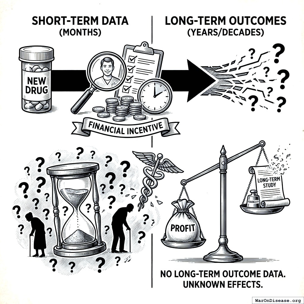 Data collection can be as short as several months. You take the drug for forty years. The gap between these two numbers is where side effects live. Nobody checks. It’s like reviewing a marriage based on the wedding.