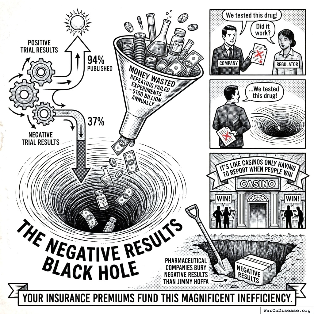 Pharmaceutical companies bury negative results deeper than Jimmy Hoffa. Other companies waste billions testing the same dead ends. Your insurance premiums fund this magnificent inefficiency. It’s like casinos only having to report when people win. Actually, I think casinos DO have to report when people win. So drugs get less honesty than gambling. I keep finding these comparisons and they keep getting worse.