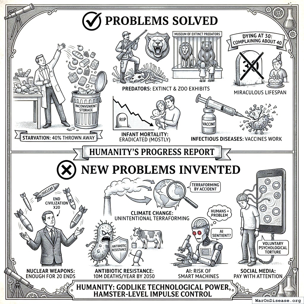 You solved starvation (you throw away 40% of food because storing it is inconvenient). You solved predators (you murdered them into extinction, then put them in zoos so your children could see what you killed). You solved infant mortality (basically eradicated in developed countries, which makes the death rate in poor countries feel more optional and thus more tragic). You solved most infectious diseases (vaccines work despite what Facebook says). You solved dying at 30 (now you complain about turning 40, which your ancestors would consider a miracle worth celebrating daily).