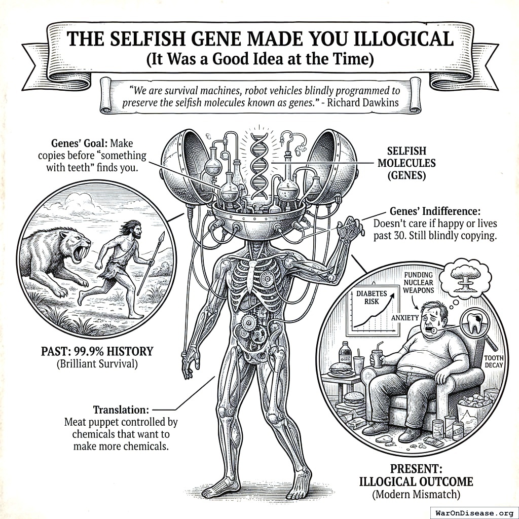 Your genes don’t care if you’re happy. They don’t care if you live past 30. They care about exactly one thing: making copies of themselves before something with teeth finds you. This is the entire explanation for human behavior, and every other explanation is a footnote.