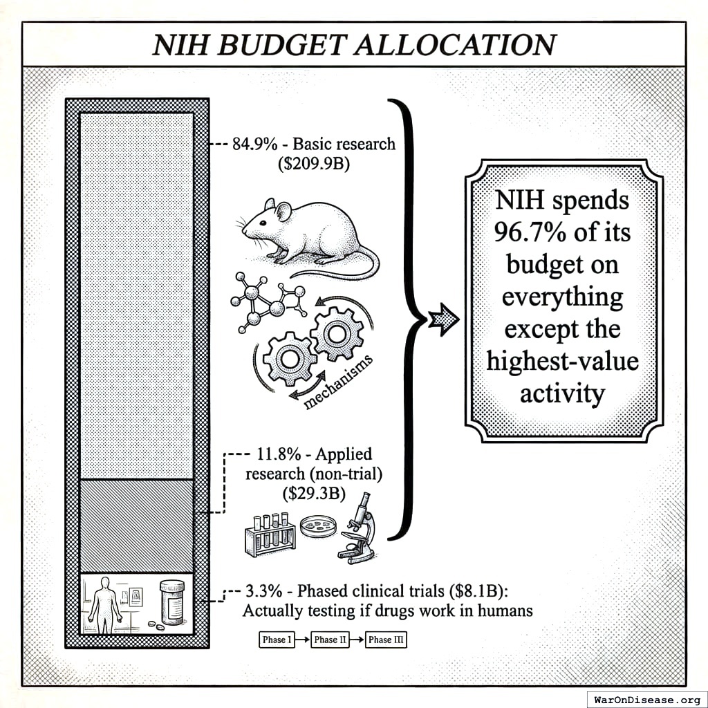 Of $247 billion the NIH spent over a decade, exactly 3.3% (95% CI: 2%-5%) went to testing which of the thousands of known-safe treatments actually work in humans162. The other 96.7% funded understanding disease mechanisms, translating discoveries toward (but never into) clinical use, training scientists, observational programs that spend billions watching disease without treating it, and a side quest engineering bat viruses, which is called “research” the way watching someone drown from a boat is called “lifeguarding.”