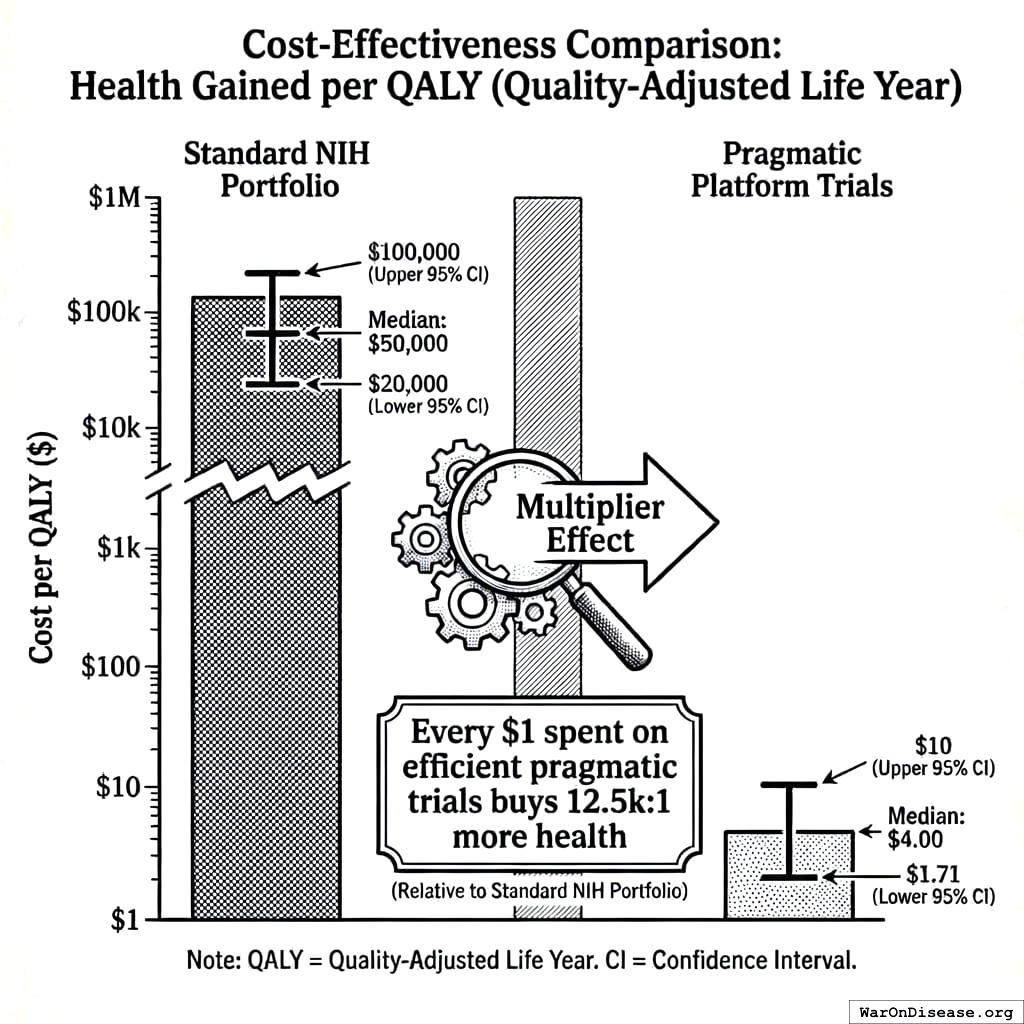 Now imagine the other timeline. Not as an indictment, but as a measure of what was lost. If the NIH had allocated even 20% of its $1.1 trillion to pragmatic trials over 50 years (the remaining 80% still on basic research), that produces 440 million patient-trials at RECOVERY efficiency ($500 (95% CI: $400-$2,500) per patient). That is enough to test every safe compound against every major disease, multiple times, with replication. The Oxford RECOVERY trial tested 48,000 patients and found a treatment that saved over a million lives, in 100 days, for $24 million. Multiply that across 440 million patients and 50 years and the number of lives saved becomes difficult to calculate because the diseases start disappearing and the math changes.