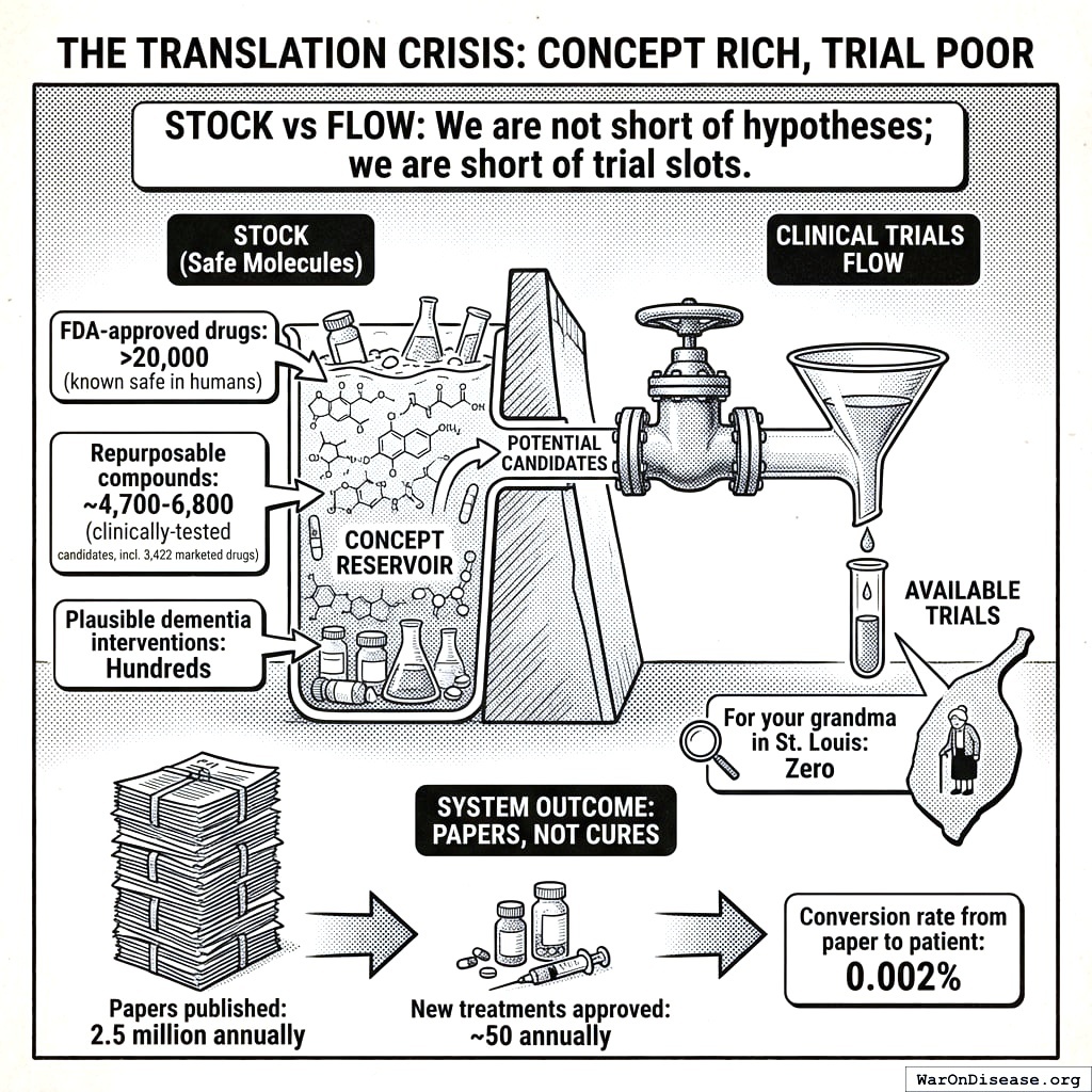 There are over 20,000 FDA-approved drugs that are known to be safe in humans. Thousands more clinically-tested candidates are gathering dust153, including over 3,000 marketed drugs that could be repurposed for diseases nobody’s tried them on. In Alzheimer’s alone, researchers have identified hundreds of safe drugs worth testing, yet less than 10% are in active trials154. And the number of clinical trials available for your grandma in St. Louis? Zero. You have a warehouse of safe molecules that have never been systematically tested for new uses. The warehouse is full. The testing facility is closed for a team-building retreat.