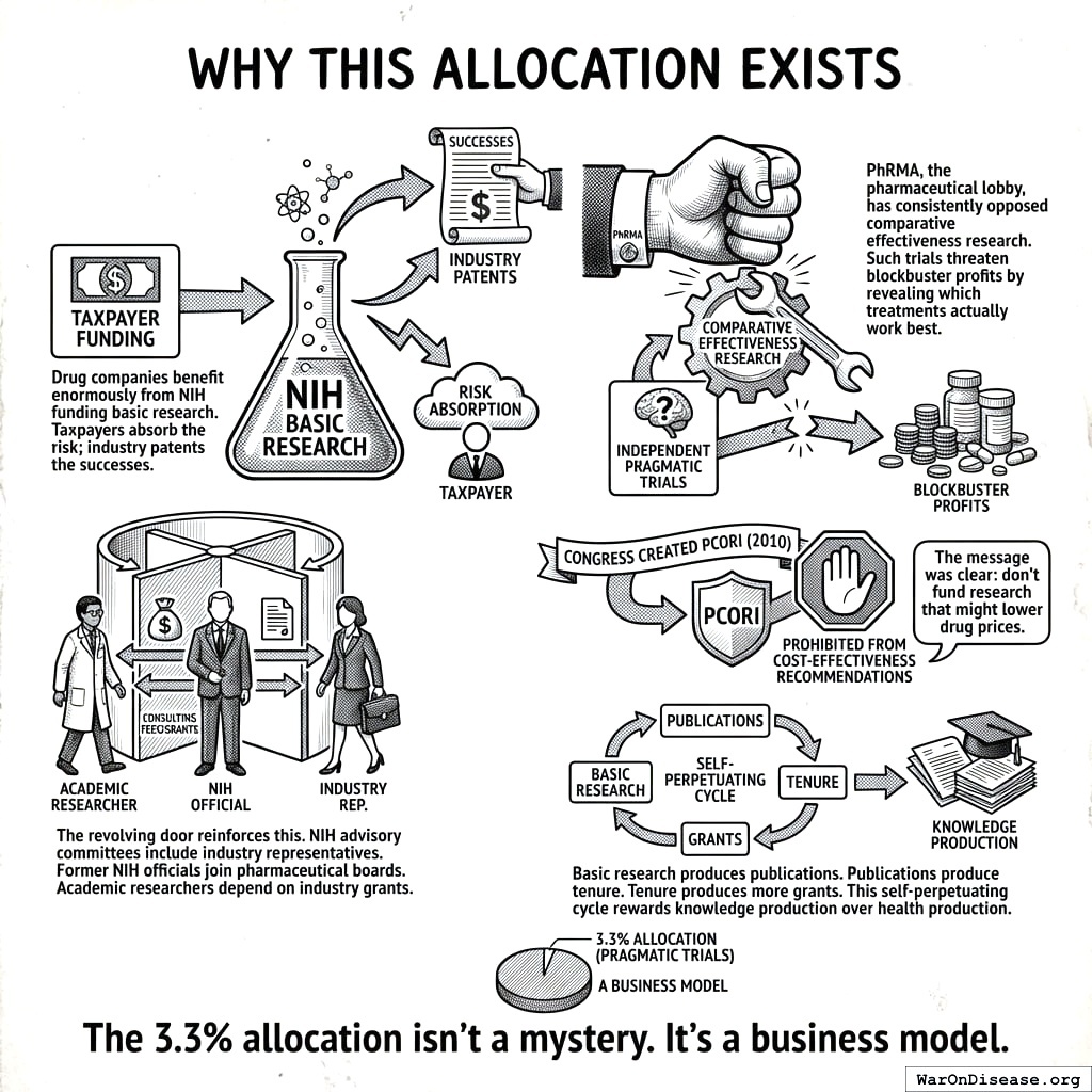 The 3.3% (95% CI: 2%-5%) allocation isn’t a mystery. It’s a business model. Basic research produces publications. Publications produce tenure. Tenure produces more grants. Individual researchers want cures. The system rewards them for everything except producing one. Actual treatments are a byproduct that occasionally happens when someone forgets to optimize for papers and accidentally optimizes for results instead. It’s like a restaurant where the chefs are passionate about food but get promoted based on how many menus they print. The menus are exquisite. They have won awards. The diners are eating the menus. Nobody has mentioned this.