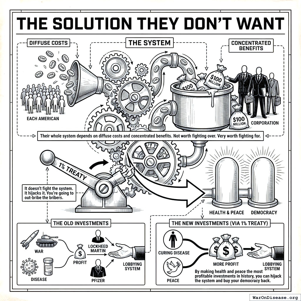Pharma: $500 billion in profits (concentrated)147. Patients: $1,500 each (diffuse). Winner: pharma (obviously).