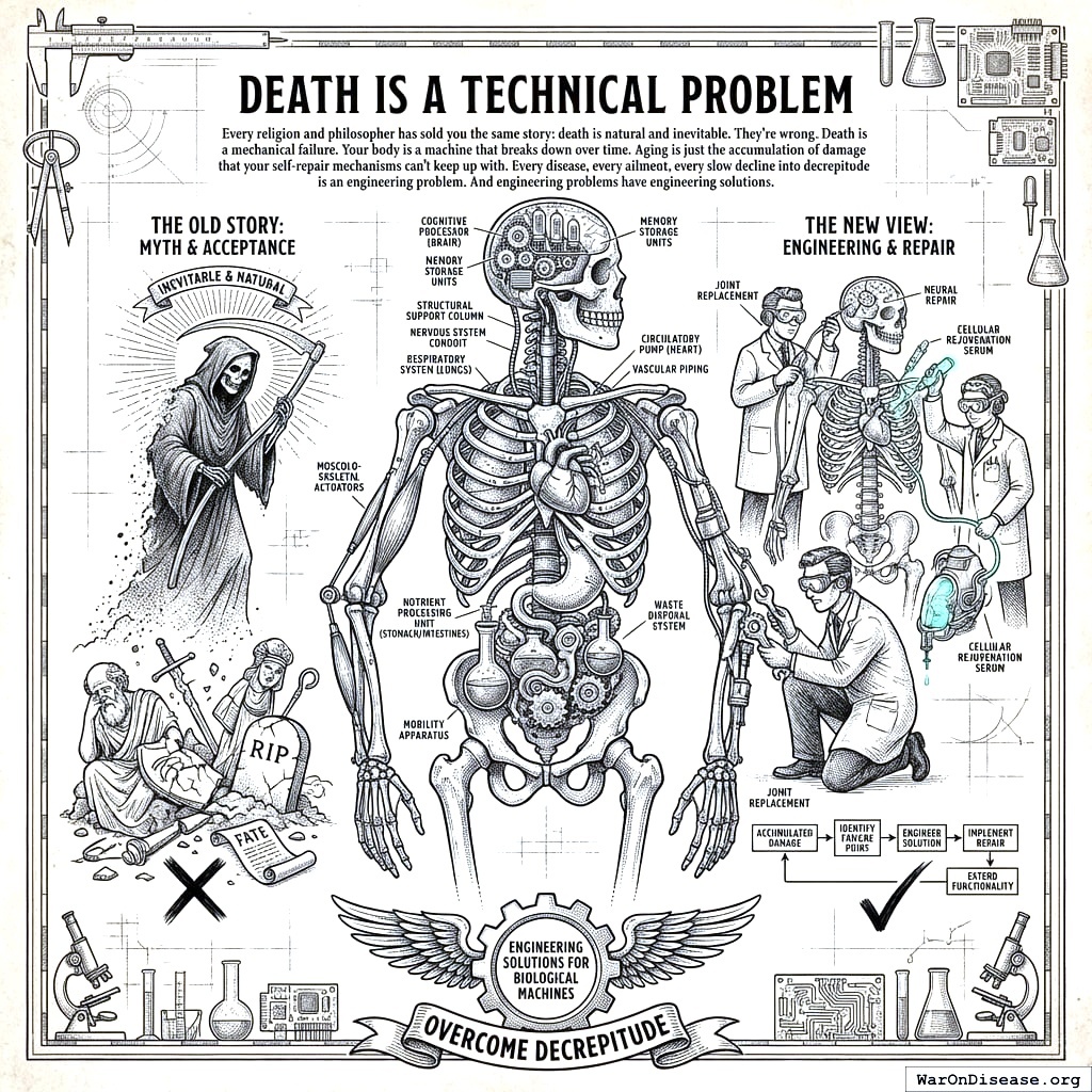 Death is what happens when your parts break faster than your body can fix them. That’s not philosophy. That’s a maintenance schedule. Every disease is a mechanical failure. Every ailment is a broken part. Every slow decline into decrepitude is an engineering problem with an engineering solution. You just keep filing them under “philosophy” and “the human condition,” which is like filing a flat tire under “existentialism.”