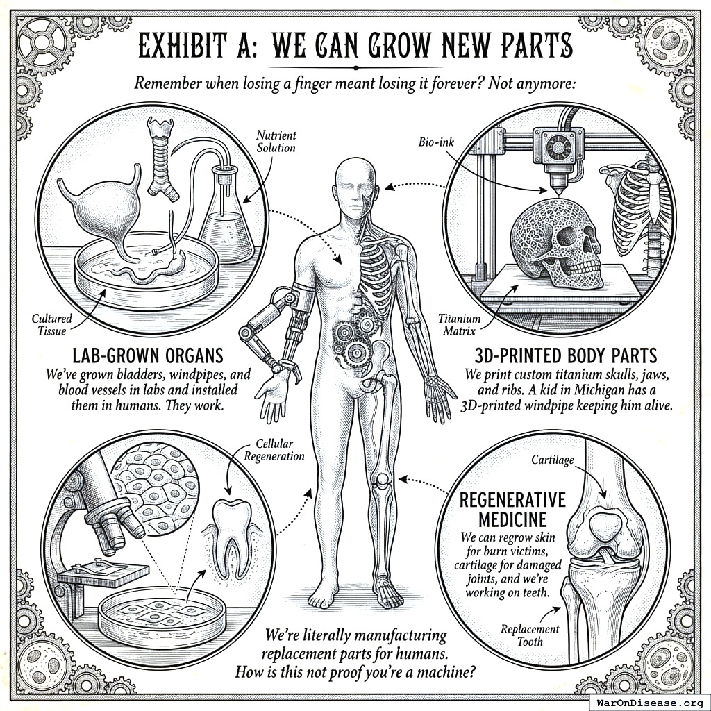 The same technology you use to print novelty phone cases, you’re using to print throats. You are manufacturing replacement human organs on the same type of machine that makes Yoda figurines. If that doesn’t prove you’re a machine, I’m not sure what level of evidence you require. Perhaps someone could print you a new brain so you can process it.