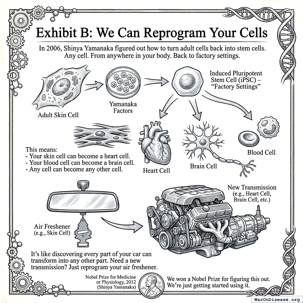 In 2006, Shinya Yamanaka figured out how to turn adult cells back into stem cells148. Any cell. From anywhere in your body. Back to factory settings. Like holding down the reset button, except on a skin cell. And it works.