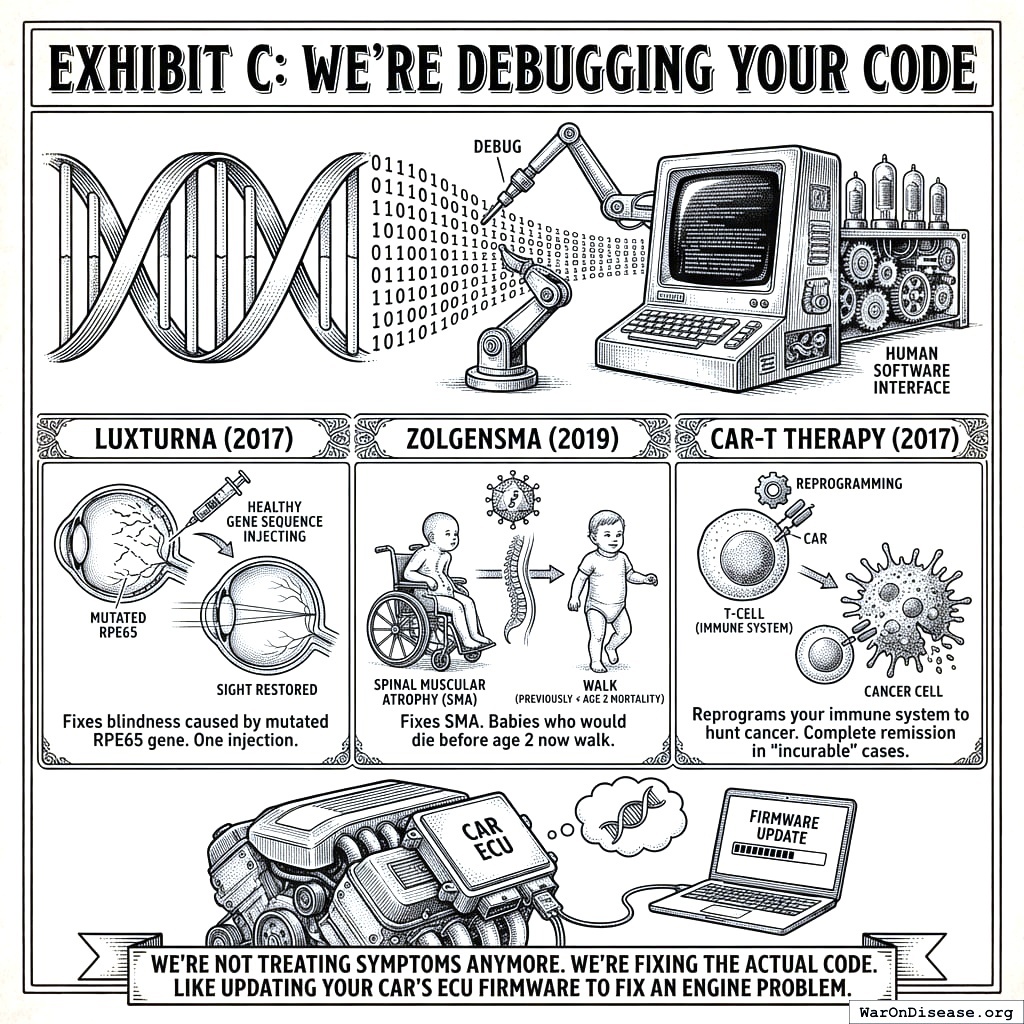 • Luxturna149 (2017): Fixes blindness caused by a mutated RPE65 gene. One injection. Sight restored. The entire disease was a typo. One letter wrong, and you couldn’t see. They fixed the letter.
