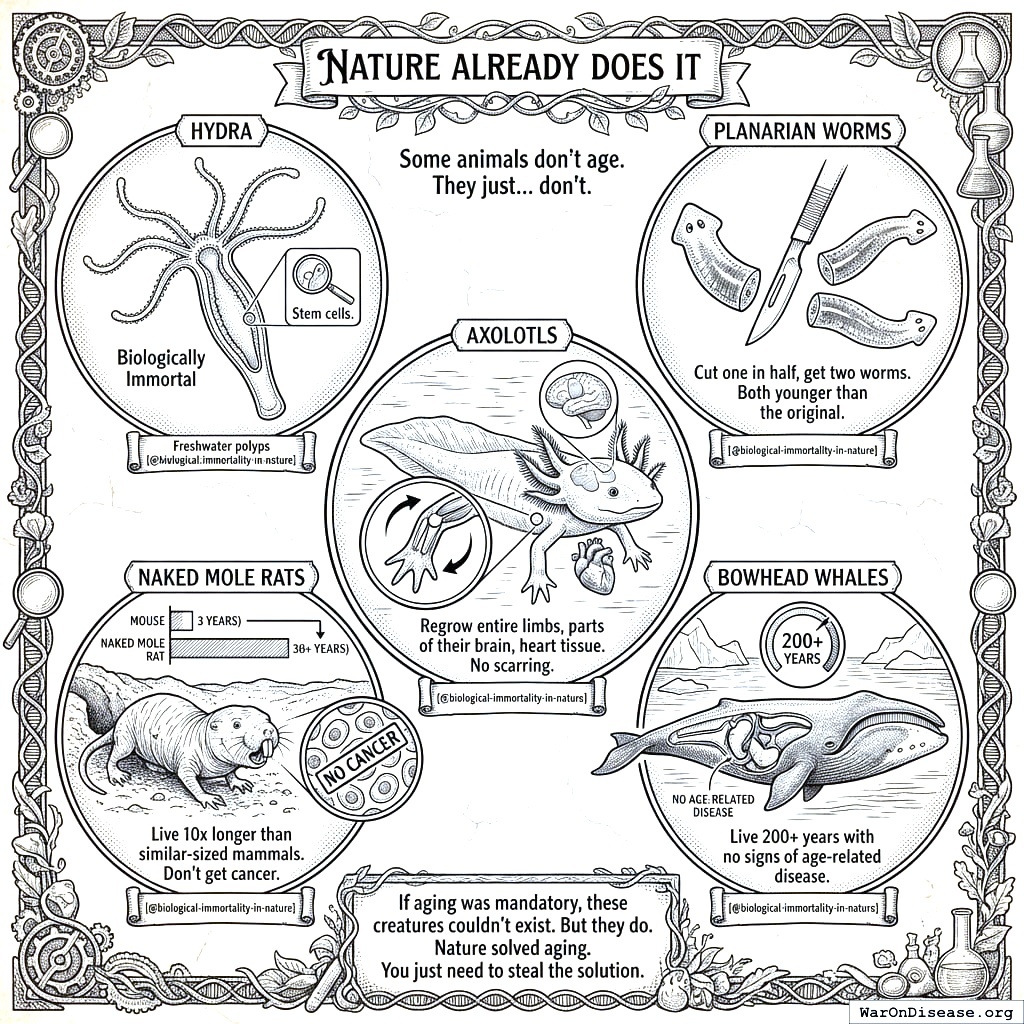 • Bowhead whales: Live 200+ years with no signs of age-related disease150. A whale born when Napoleon was alive is still swimming around right now, perfectly healthy, probably judging you.