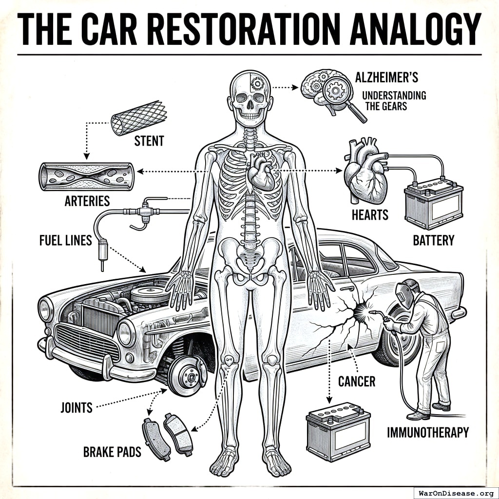 You’re making progress on the harder stuff, too. Cancer is frame damage, and immunotherapy is your new welding torch. Alzheimer’s is a bad transmission, and you’re finally starting to understand the gears.