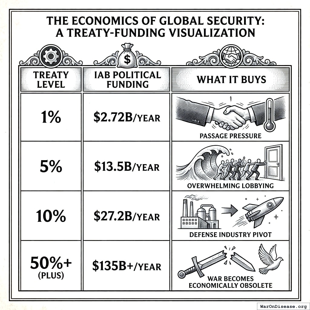 The 10% going to Incentive Alignment Bonds150 creates a machine that only goes one direction. When 1% passes, $2.72 billion/year flows to people whose entire financial interest is getting the treaty to 2%. When 2% passes, the pressure doubles. Each success makes the next one easier (and more profitable). This is a ratchet that can eventually redirect all military spending from war to health.