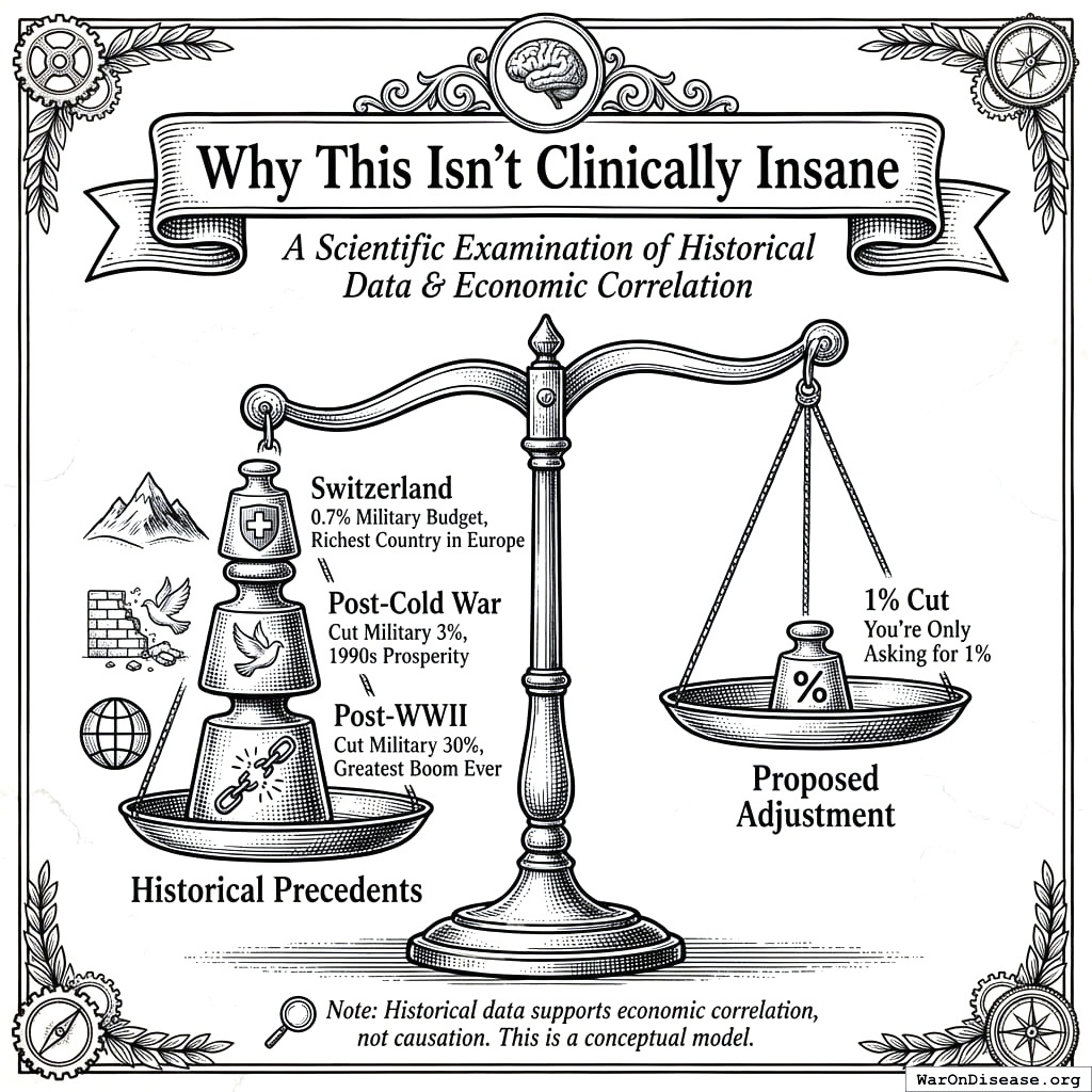 You ask every nation on Earth to cut military spending by 1%. Just 1%. They keep the other 99% for wars and parades and whatever else militaries do when they’re not accidentally losing trillions.