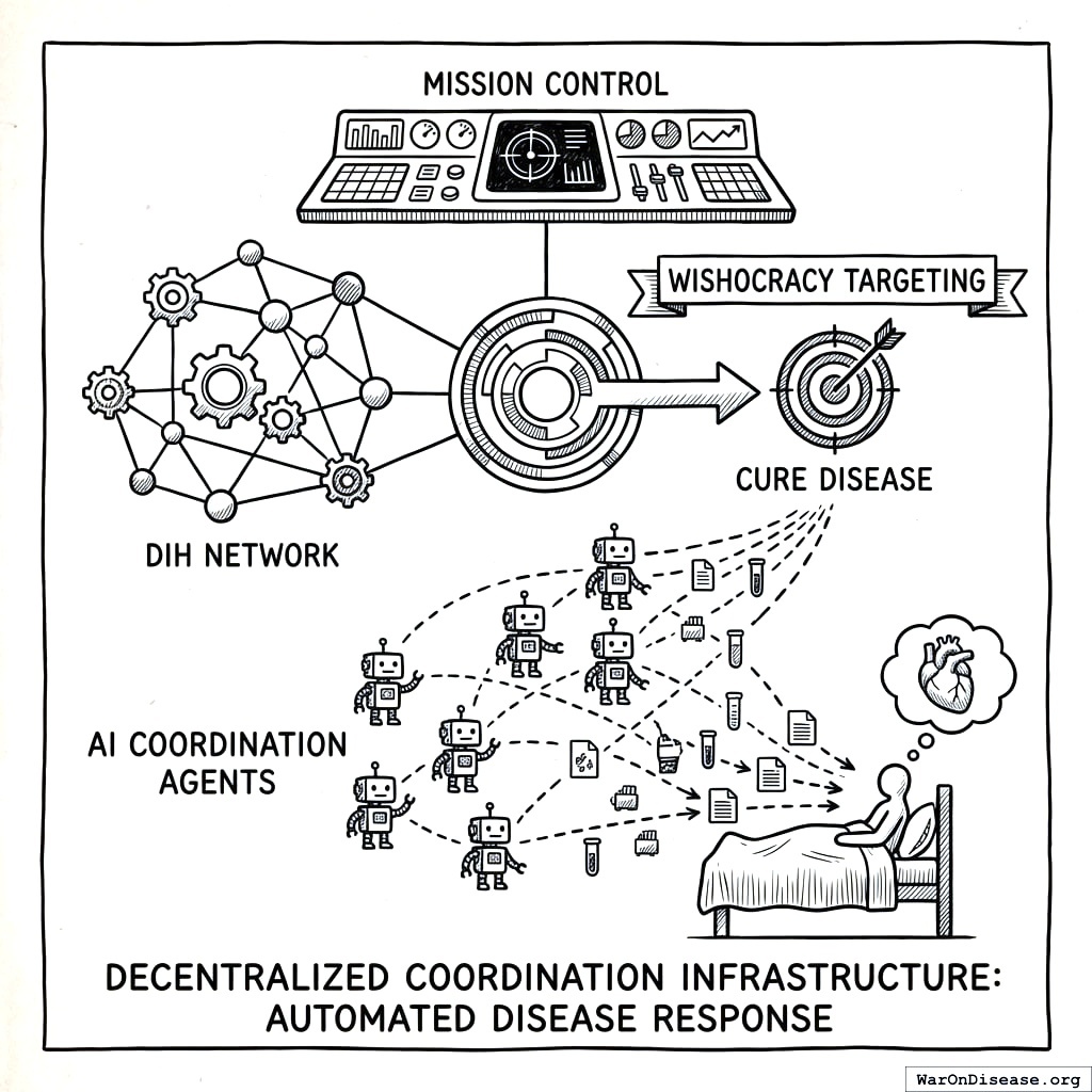 You’ve got mission control, a network of Decentralized Institutes of Health (DIH), and a targeting system (Wishocracy146). Now you need an army of AI agents to do the work. Humans are sleeping, arguing on Twitter, or attending conferences that accomplish nothing.