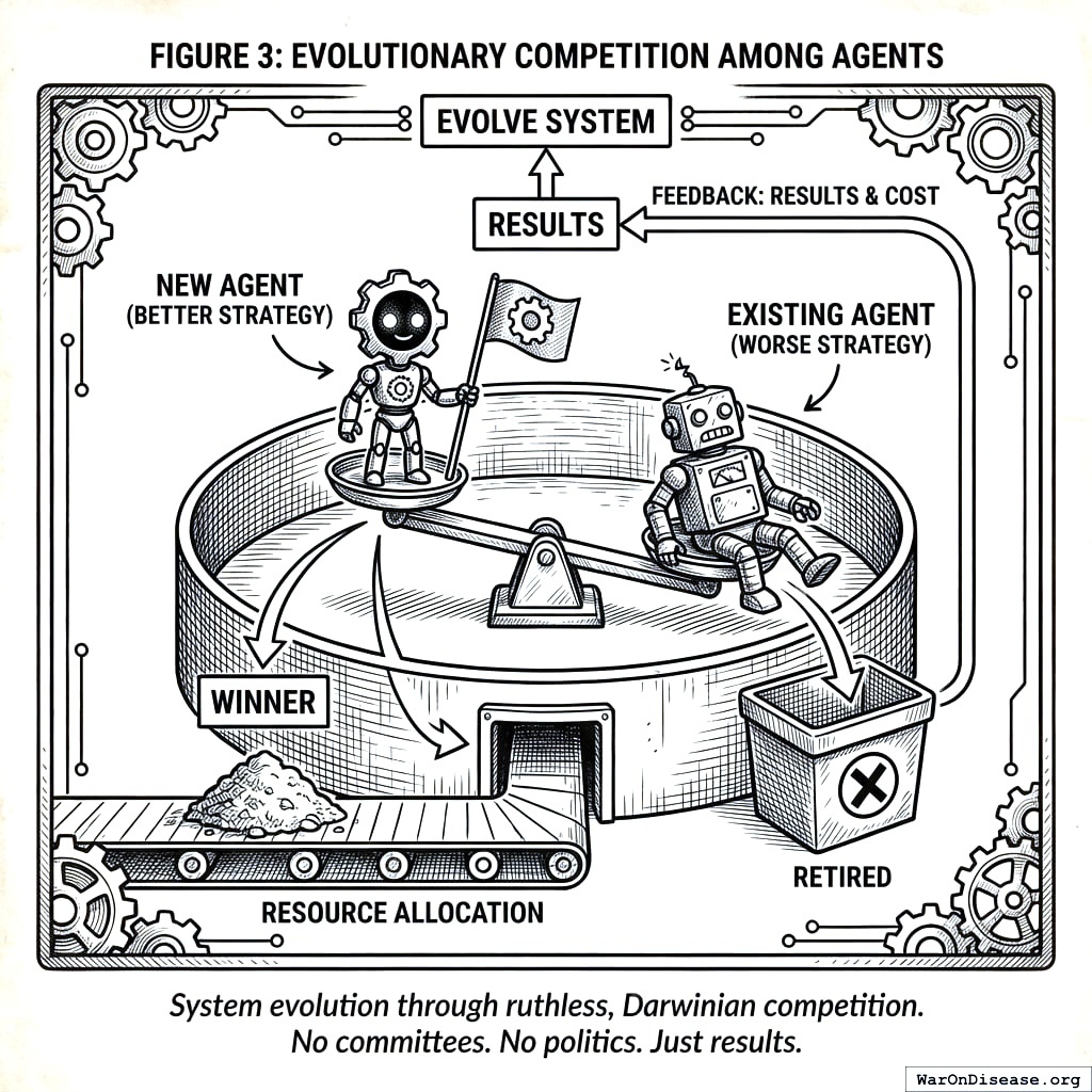 Someone thinks they have a better way to find cancer researchers? They build an agent for it. You run both agents side-by-side. You measure which one delivers better results for less cost. The winner gets more resources. The loser gets improved or retired (but gently, because it’s code, not a person you’re firing via Zoom).