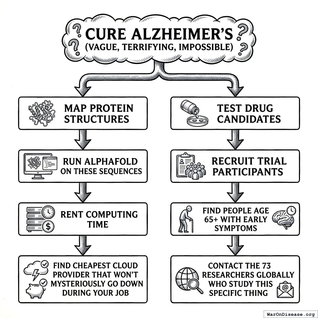 Wishocracy’s Task Tree breaks “Cure Alzheimer’s” (impossible, vague, makes you want to give up) down into executable tasks. Examples: “Find researchers studying protein misfolding” or “Recruit trial participants age 65+ with early symptoms.”