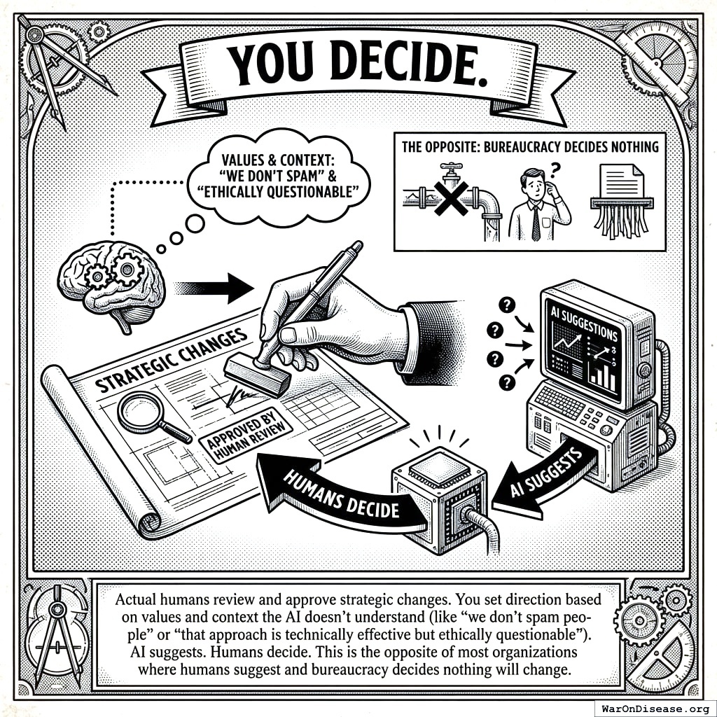 Actual humans review and approve strategic changes. You set direction based on values and context the AI doesn’t understand (like “we don’t spam people” or “that approach is technically effective but ethically questionable”). AI suggests. Humans decide. This is the opposite of most organizations where humans suggest and bureaucracy decides nothing will change.